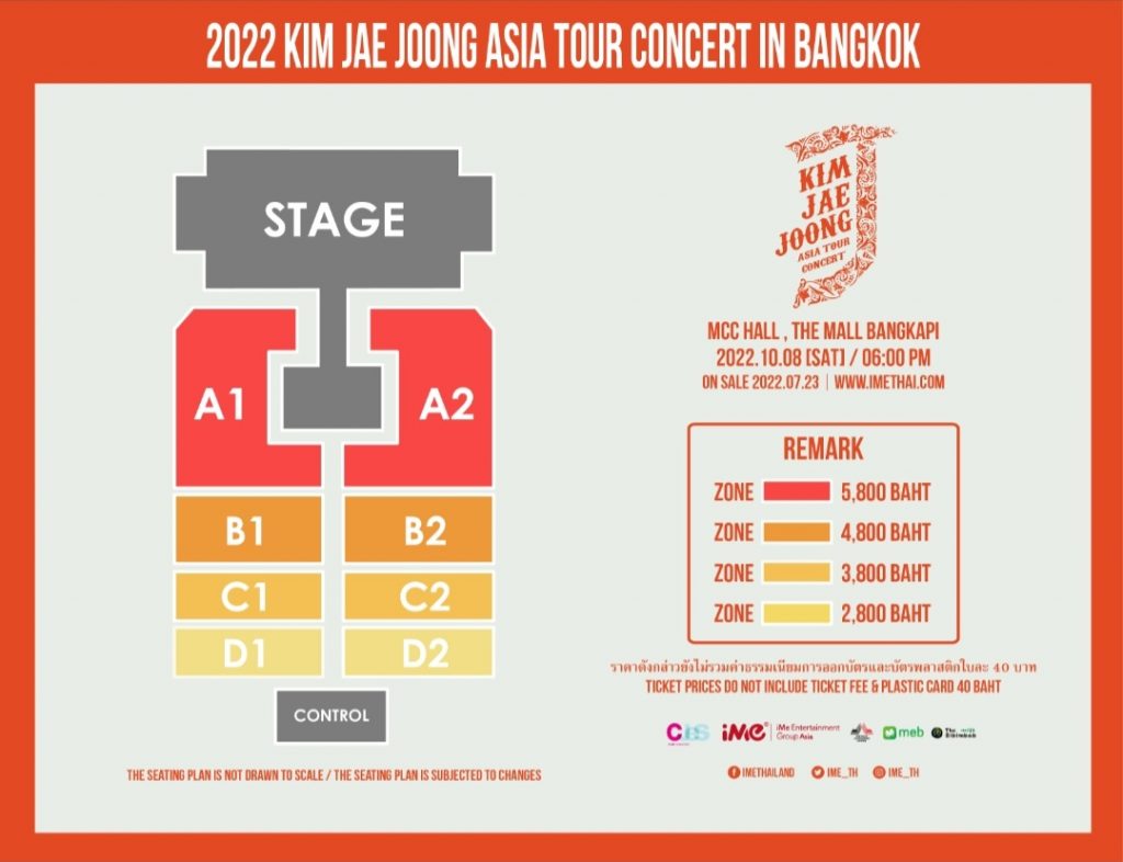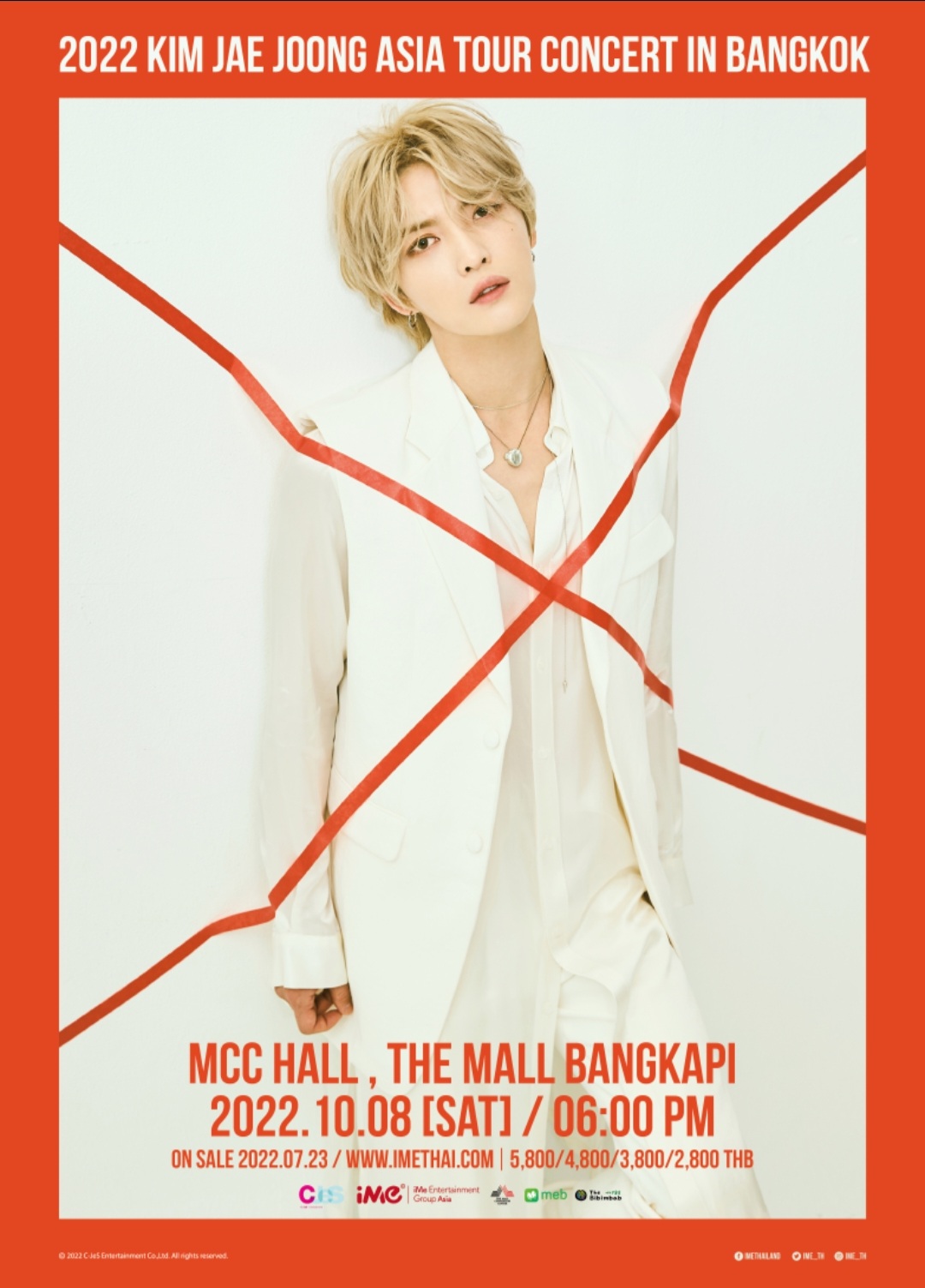 หลังจาก “คิมแจจุง” ไม่ได้กลับมาพบกับ แฟนๆ ชาวไทยนานกว่า 3 ปี เนื่องด้วยสถานการณ์การแพร่ระบาดของเชื้อ COVID-19 ทำให้งาน เอเชียทัวร์คอนเสิร์ต ต้องถูกเลื่อนจัดงานไปหลายครั้ง แต่ในที่สุดหนุ่ม คิมแจจุง ก็ได้ประกาศวันแสดงใหม่ และสถานที่จัดงานใหม่เป็นที่เรียบร้อย ตอนนี้แจแฟนชาวไทยเคลียคิวด่วน พร้อมเตรียมตัวมาสนุกไปด้วยกันกับ คิมแจจุง ในงาน “2022 KIM JAE JOONG ASIA TOUR CONCERT IN BANGKOK” ที่จะจัดขึ้นในวันเสาร์ที่ 8 ตุลาคม 2565 เวลา 18.00 น. ณ MCC HALL เดอะมอลล์ บางกะปิ โดยจะเปิดขายบัตรในวันเสาร์ที่ 23 กรกฎาคมนี้ เวลา 10.00 น. เป็นต้นไป ผ่านทาง www.imethai.comราคา 5,800 / 4,800 / 3,800 / 2,800 บาท