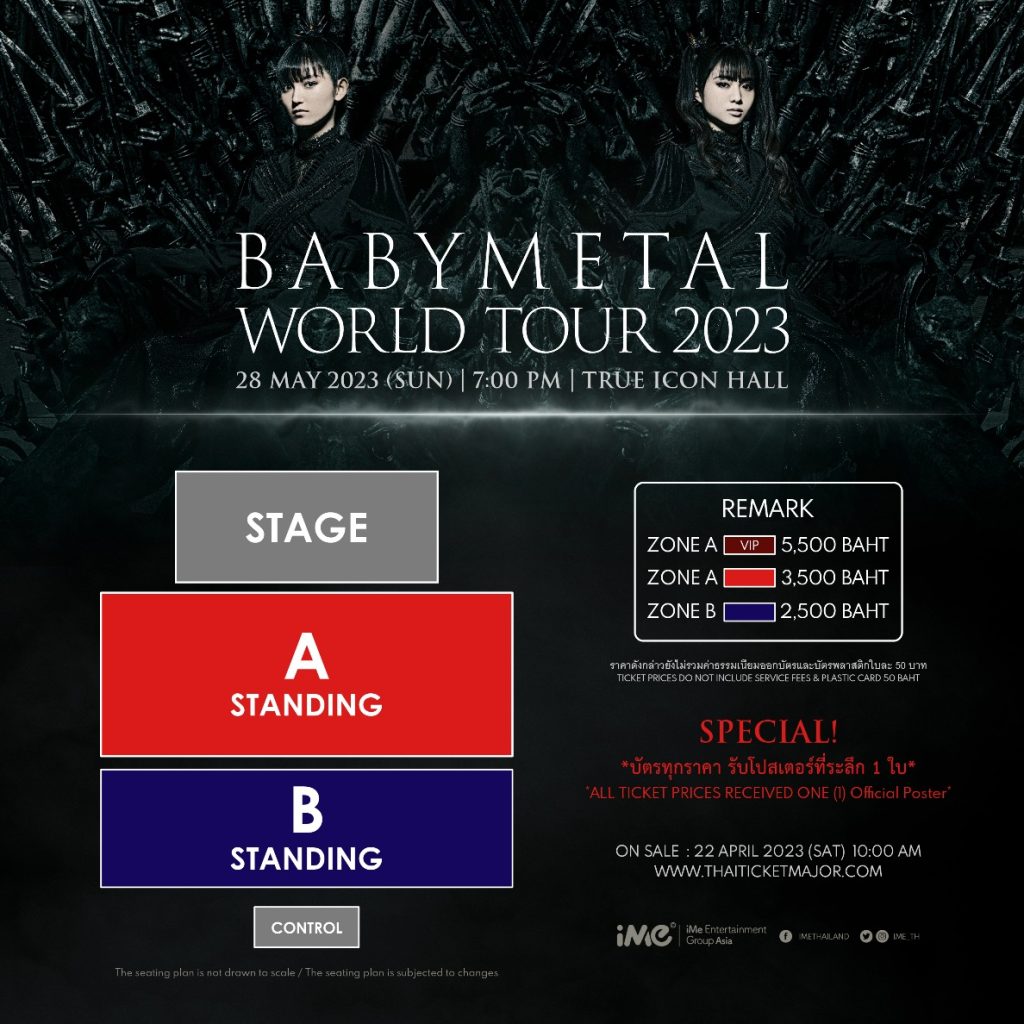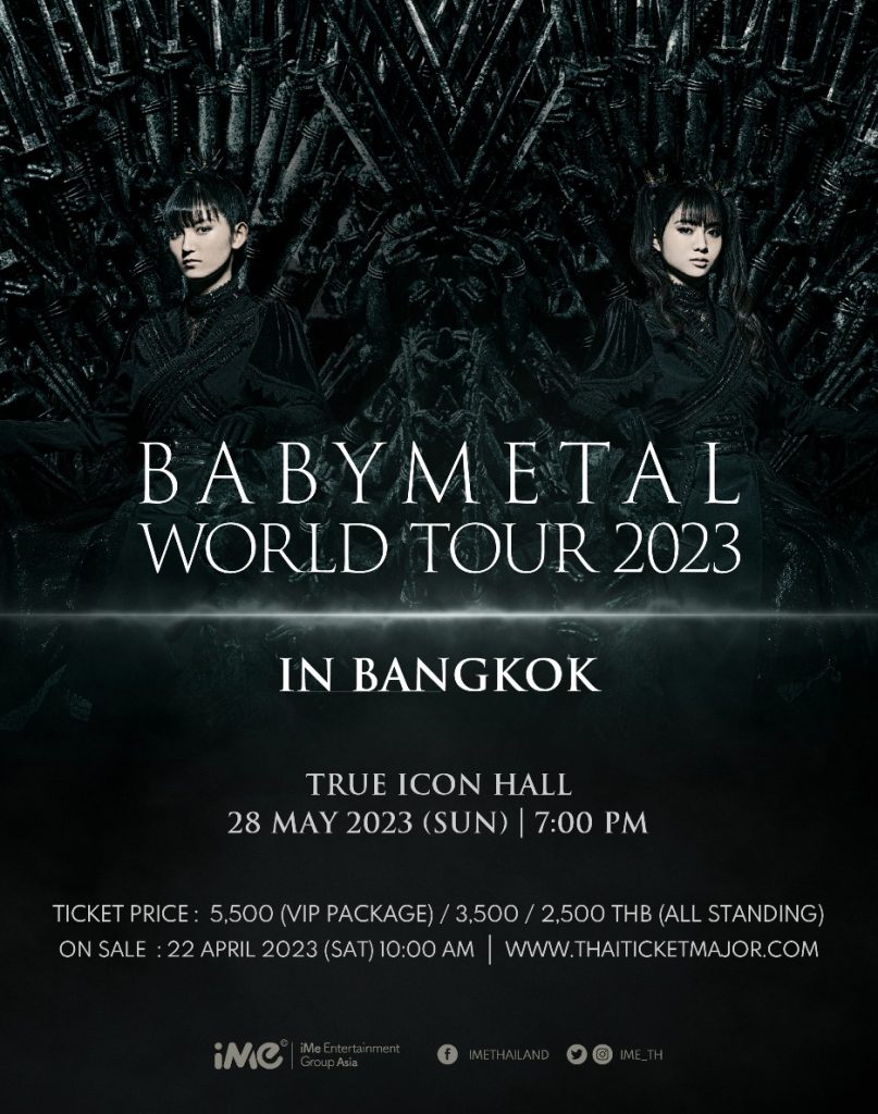 ไอมี่ไทยแลนด์ ผู้จัดงาน ร่วมกับสาวๆ BABYMETAL พร้อมแล้วที่จะเสิร์ฟความสนุก และความมันส์จัดเต็มแสง สี เสียง และขนเพลงฮิตมากมายมาให้แฟนเพลงชาวไทยได้มาร่วมเสพความสนุกไปด้วยกันในงาน BABYMETAL WORLD TOUR 2023 IN BANGKOK ซึ่งเหล่าสาวกเมทัลร็อค และแฟนๆ ของสาวๆ สามารถมาพบกันได้ในวันอาทิตย์ที่ 28 พฤษภาคม 2566 เวลา 19.00 น. ณ TRUE ICON HALL ชั้น 7 ศูนย์การค้าไอคอนสยาม โดยเตรียมตัวจับจองบัตรกันได้เลยในวันเสาร์ที่ 22 เมษายน 2566 ผ่านทาง ไทยทิกเก็ตเมเจอร์ ทุกสาขา และ www.thaiticketmajor.com บัตรราคา 5,500 (VIP) / 3,500 และ 2,500 บาท สำหรับบัตร VIP จะได้รับบัตรชมการแสดงโซน A (บัตรยืน) พร้อมสิทธิ์ในการเข้าชมการแสดงก่อนใคร, ของที่ระลึก Limited Edition, สายคล้องคอ พร้อมป้ายห้อยที่ระลึก, โปสเตอร์ที่ระลึก และสิทธิ์ในการซื้อสินค้าออฟฟิเชียลก่อนใครในวันงาน