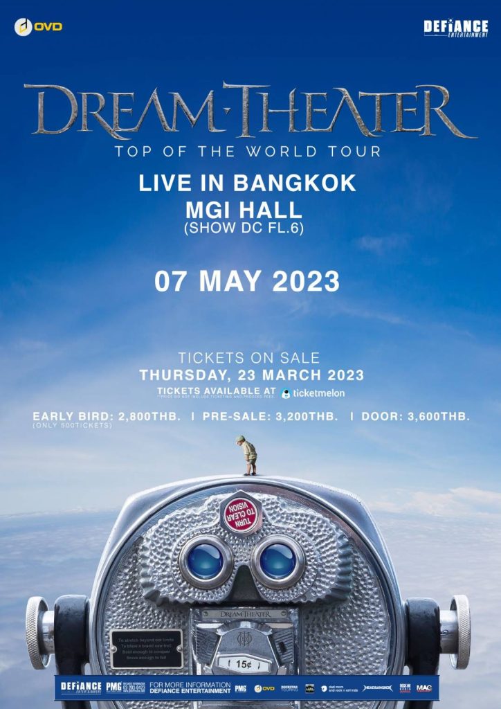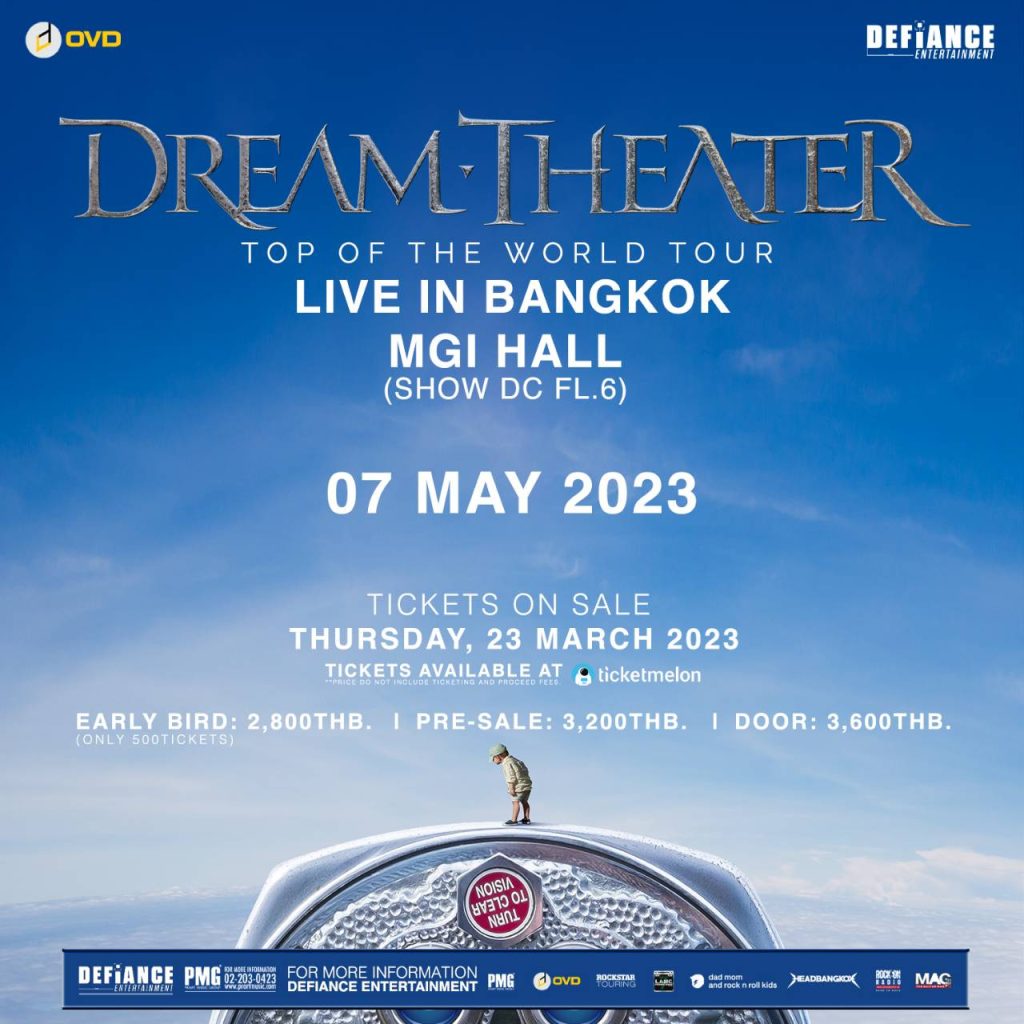 ทัวร์ Top of The World ของวง Dream Theater ออกทำการแสดงมาแล้วทั่วโลกเกือบ 100 โชว์ ได้รับเสียงชื่นชมอย่างล้นหลาม จากการแสดงอันเฉียบคม เซ็ตลิสต์ที่ควบรวมไว้ทั้งเพลงคลาสสิกและเพลงใหม่ๆ ทำให้คอนเสิร์ตของพวกเขาเต็มเปี่ยมด้วยความน่าตื่นเต้น ทั้งกับคนที่เคยสัมผัสการแสดงของวงมาแล้วในทัวร์ก่อนๆ รวมถึงคนที่เพิ่งมาชมเป็นครั้งแรก โดยพวกเขามีเป้าหมายมาปิดทัวร์ครั้งล่าสุดนี้ในโซนเอเชีย ก่อนหยุดพักยาว แน่นอนว่ามันจะเป็นการทิ้งทวนเพื่อสร้างความประทับใจให้เหล่าแฟนเพลงแบบสุดพลังฝีมืออย่างไม่ต้องสงสัย ดังนั้นการมาเยือนเมืองไทยของ Dream Theater ในวันที่ 7 พฤษภาคม 2566 จึงถือว่าไม่ควรพลาดด้วยประการทั้งปวง บัตรเปิดขายแล้ว Pre-Sale: 3200 บาท Door Ticket : 3600 บาท ซื้อได้ทาง www.ticketmelon.com/defianceentertainment/dreamtheater