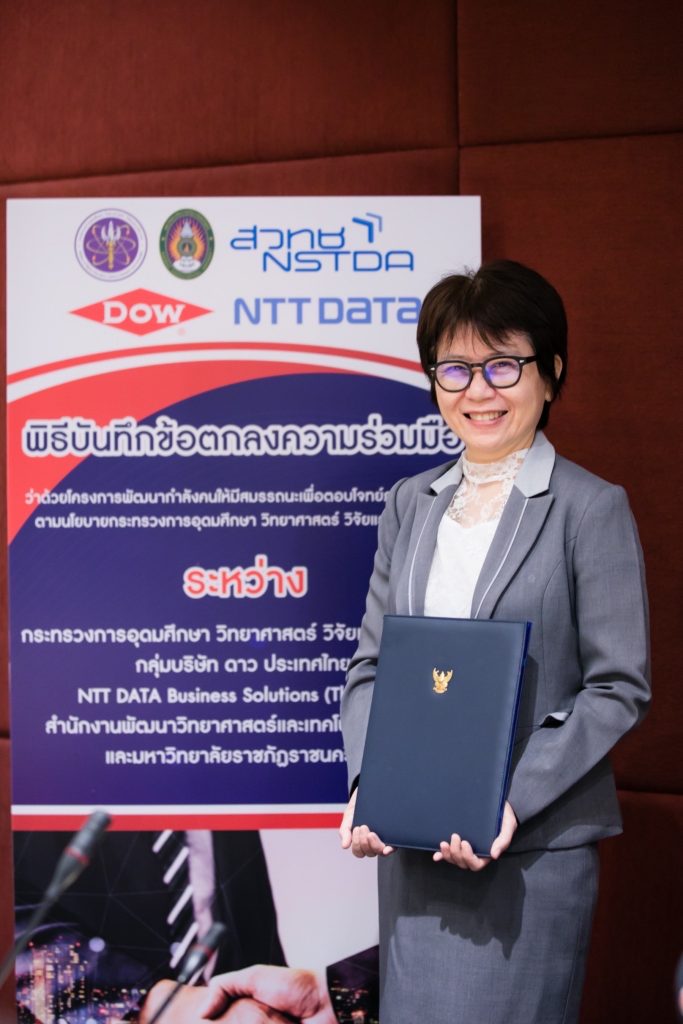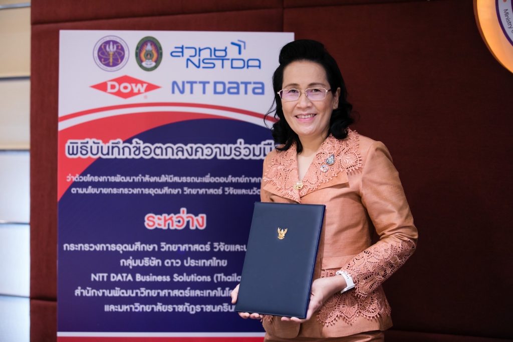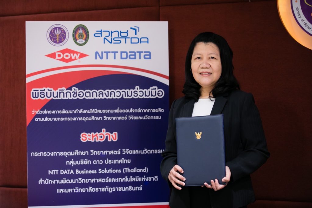 กรุงเทพ – 28 กันยายน 2565 มหาวิทยาลัยราชภัฏราชนครินทร์ ร่วมกับ กระทรวงการอุดมศึกษา วิทยาศาสตร์ วิจัยและนวัตกรรม กลุ่มบริษัท ดาว ประเทศไทย NTT DATA Business Solutions (Thailand) Ltd. และ สำนักงานพัฒนาวิทยาศาสตร์และเทคโนโลยีแห่งชาติ ร่วมลงนามบันทึกข้อตกลงร่วมมือการดำเนินการ ว่าด้วยโครงการพัฒนากำลังคนให้มีสมรรถนะเพื่อตอบโจทย์ภาคการผลิตตามนโยบายกระทรวงการอุดมศึกษา วิทยาศาสตร์ วิจัยและนวัตกรรม มุ่งบูรณาการการทำงานทุกภาคส่วน เพื่อการขับเคลื่อนพัฒนาประเทศจากกำลังทรัพยากรบุคคล องค์ความรู้ เทคโนโลยี งานวิจัย สู่การพัฒนาเศรษฐกิจฐานรากของประเทศอย่างแท้จริง