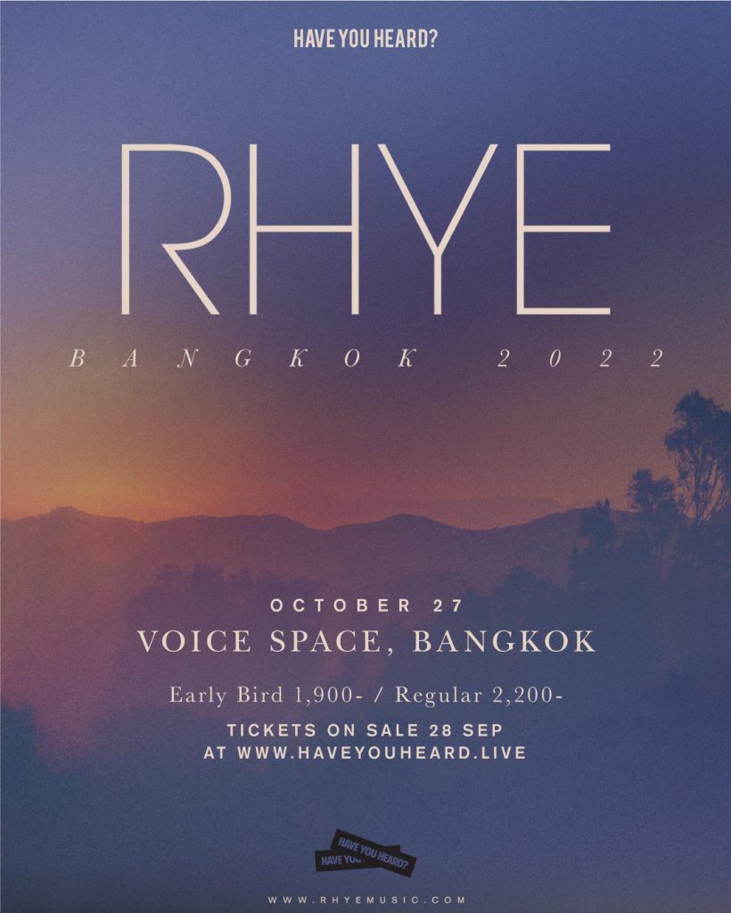 ป็นเอกลักษณ์ กลับมาอีกครั้งในงาน #HYHBKK Live! With RHYE ที่จะทำให้ทุกคนตกอยู่ในมนต์สะกดของเพลงที่ทำให้เราหลงใหล แน่นอนว่าครั้งนี้เราจะได้ฟังเพลงจากอัลบั้มล่าสุดอย่าง Home ด้วย ซึ่งงานนี้จะจัดขึ้นอย่างเต็มรูปแบบในวันที่ 27 ตุลาคม 2022 ที่ Voice Space