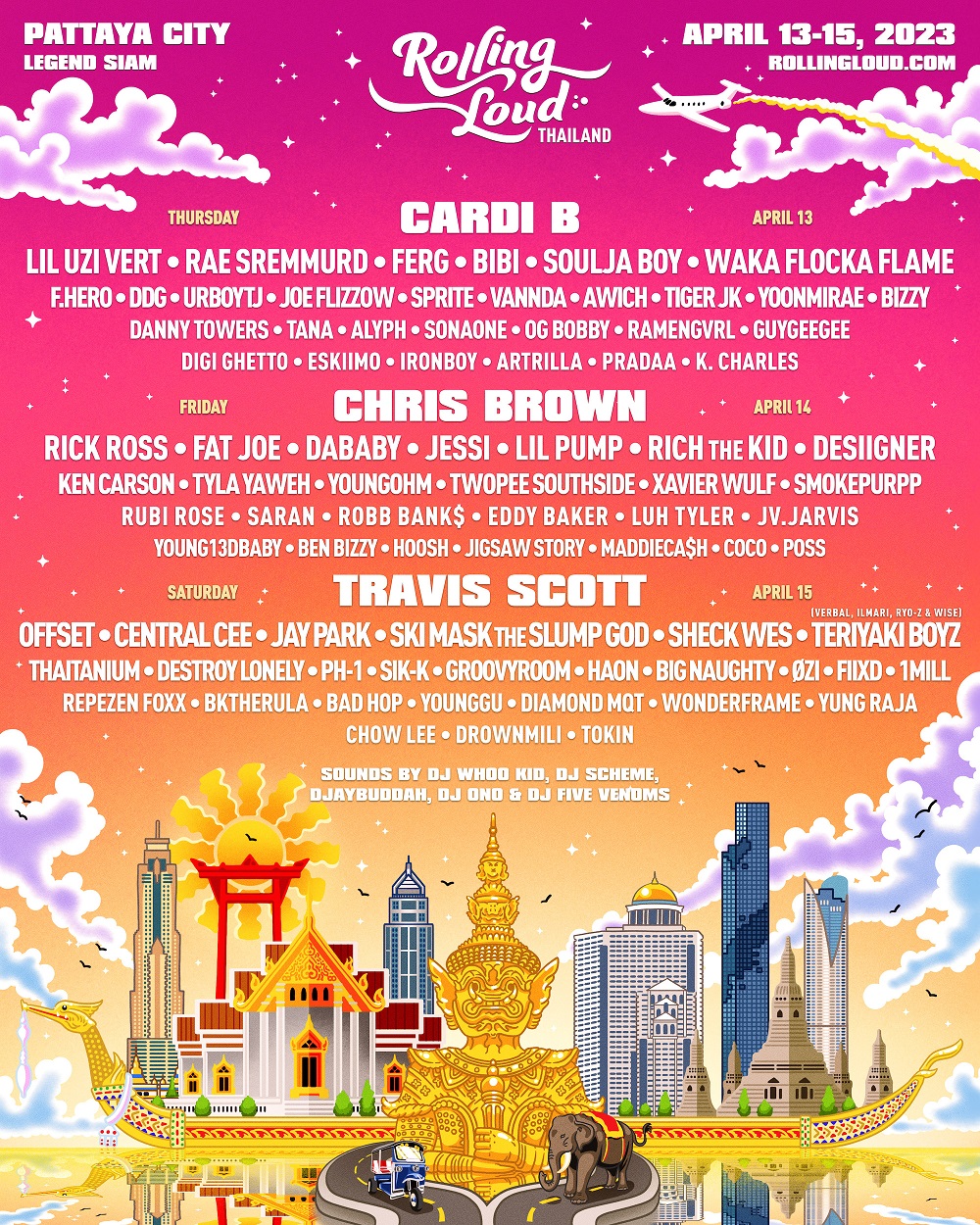 Rolling Loud สุดยอดปรากฏการณ์เทศกาลดนตรีฮิปฮอประดับโลก ที่ได้เดินทางไปจัดมาแล้วในหลากหลายเมืองทั่วโลก พร้อมแล้วที่จะมาเล่นหนักจัดใหญ่กับการเดินทางมาถึงเอเชียเป็นครั้งแรกกับ Rolling Loud Thailand 2023 ล่าสุดประกาศรายชื่อศิลปินดังระดับโลกที่มาร่วมงาน ทราวิส สก็อตต์, คาร์ดิ บี, คริส บราวน์ คอนเฟิร์มเตรียมขึ้นเวทีเป็นศิลปินเฮดไลน์ ร่วมด้วยไลน์อัพศิลปินที่มีความน่าตื่นตาตื่นใจ ไม่ว่าจะเป็นศิลปินในกระแส ศิลปินผู้คร่ำหวอดในวงการมาอย่างยาวนาน รวมถึงแร็พเปอร์สตาร์ดาวรุ่งจากประเทศไทยและประเทศอื่นๆ ในเอเชีย ซึ่งจะทำให้เทศกาล Rolling Loud Thailand 2023 ที่จะจัดขึ้น 3 วันเต็มที่ Legend Siam เมืองพัทยา ระหว่างวันที่ 13-15 เมษายน 2566 เต็มเปี่ยมไปด้วยความตื่นตาตื่นใจ โดยผู้ที่ชื่นชอบในดนตรีฮิปฮอปสามารถจองบัตรได้แล้วที่ www.rollingloud.com