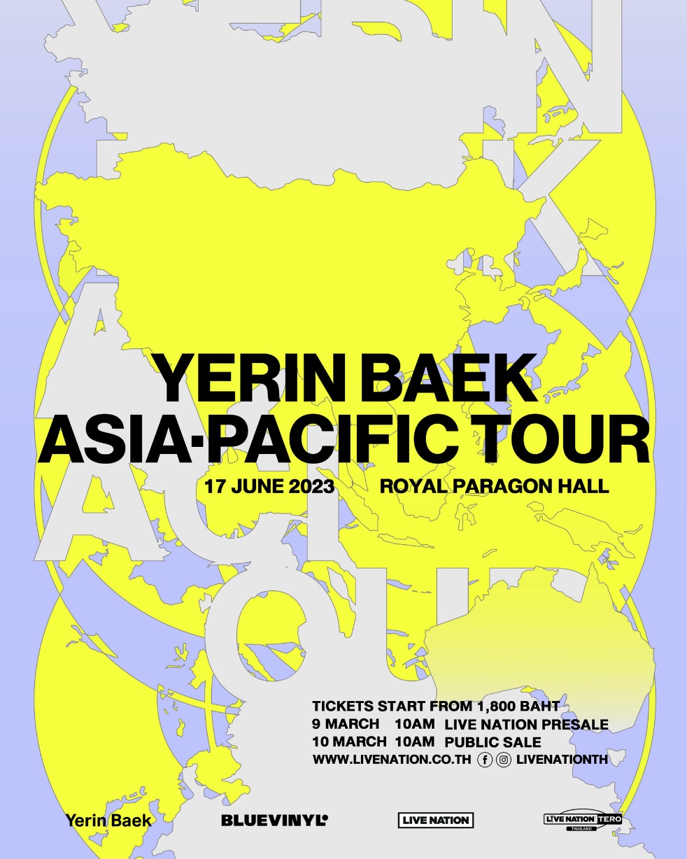 หลังจากประสบความสำเร็จในการทัวร์อเมริกาเหนือในช่วงปลายปีที่ผ่านมา เยรินออกซิงเกิล ‘New Year’ ต้อนรับปีใหม่เมื่อวันที่ 1 มกราคม แฟน ๆ ชาวไทยเตรียมตัวปล่อยใจปล่อยจอยไปกับเยริน แบค และเพลงของเธอใน ‘Yerin Baek Asia Pacific Tour’’ 17 มิถุนายนนี ้ ที่รอยัล พารากอน ฮอลล์ สยามพารากอน บัตรราคาเริ่มต้น 1,800 บาท สมาชิกไลฟ์เนชั่นเทโรซื ้อบัตรก่อนใคร 9 มีนาคมนี ้ 10.00 – 22.00 น. ทาง livenation.co.th จ าหน่ายบัตรรอบทั่วไป 10 มีนาคม เวลา 10.00น.เป็นต้นไป ทาง thaiticketmajor.com และไทยทิกเก็ตเมเจอร์ 11 สาขาหลัก